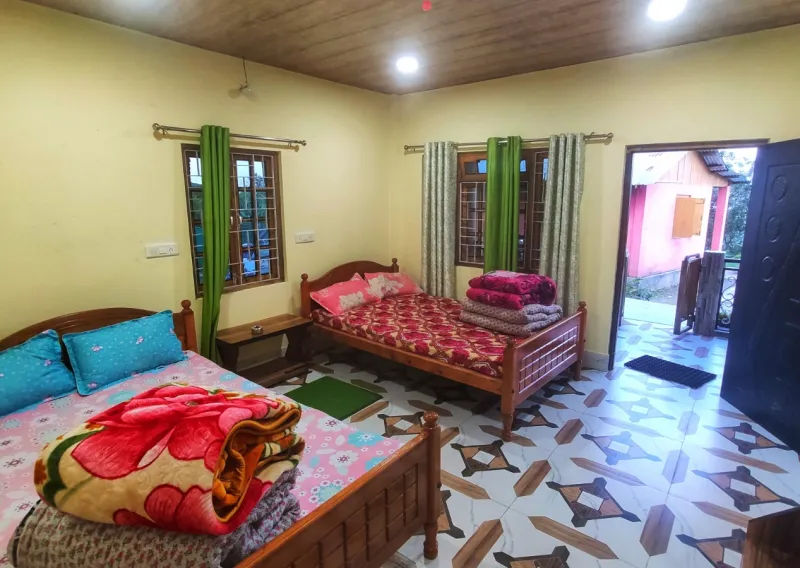 Sittong Homestay, a serene retreat located just a minute's stroll from Namthing Namthing Lake, is a haven for tranquility seekers. Surrounded by picturesque mountains cloaked in lush greenery, this homestay offers a front-row seat to nature's beauty right from its own lawn. One of the primary reasons Sittong is famous is its orange farming; in the winter, you can see a green valley become orange due to this growing. For nature enthusiasts and adventure lovers, the meandering trails through the nearby forested hills provide the perfect setting for short hikes. During the monsoon season, the atmosphere takes on an enchanting quality as the entire area is enveloped in misty clouds, while the tall trees cast a slightly eerie aura. Sittong Homestay promises an idyllic escape for those yearning to connect with nature amidst this mesmerizing landscape.