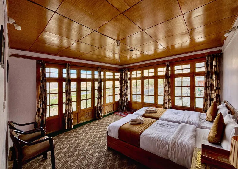 Nestled amidst the pristine beauty of Pangong, Pangong Homestay offers an enchanting escape into nature. Surrounded by snow-capped mountains and overlooking the distant Pangong Lake, this homestay provides a serene yet adventurous getaway. The beautifully decorated rooms feature traditional wooden interiors, bathing in natural sunlight with stunning views of the lake and mountain ranges. Behind the property, majestic mountains further enhance the stunning landscape.