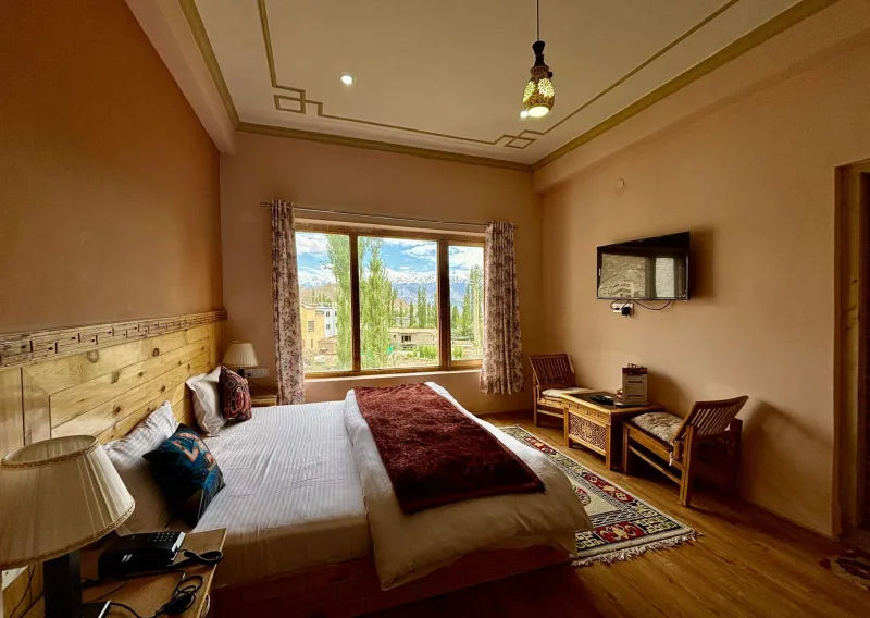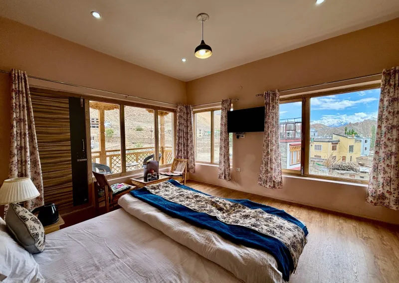 Mornings at Leh Retreat are a serene awakening to nature’s splendor. Open your eyes to snow-capped peaks glowing in the golden light of dawn, as the crisp mountain air revitalizes your senses. Embark on adventures through scenic trails, meandering riversides, and untouched landscapes, where the soothing sounds of nature accompany every step of your journey. As day transitions into evening, the retreat envelops you in its cozy warmth. Relax after your explorations and enjoy the company of fellow travelers as the majestic peaks fade into twilight. Indulge in delicious Ladakhi cuisine crafted with local ingredients, offering an authentic taste of the region’s rich culinary heritage. Leh Retreat’s thoughtfully designed accommodations combine rustic charm with modern comforts, creating a serene space where you can unwind and recharge. Every room is a haven of coziness, providing the perfect setting to reflect on the day’s experiences and prepare for the adventures ahead.