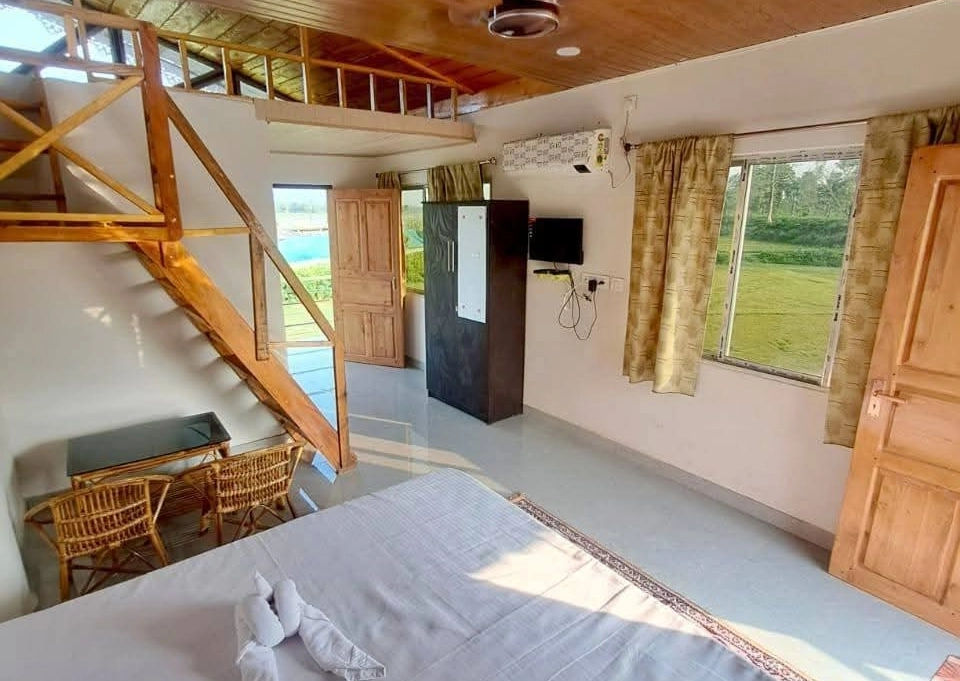 Reaching Lataguri Eco Stay is convenient from both rail and air hubs of North Bengal. From New Mal Junction railway station (about 30 km away), you can hire a private taxi for a direct, 45–60 minute ride through tea gardens and forested stretches, or opt for a shared jeep from the station area towards Lataguri town. Buses also connect New Mal to Lataguri and nearby stops; from there, a short local transfer will bring you to the stay near the River Bridge in Neora. From Bagdogra International Airport (approximately 71 km away), pre-booked private taxis are the most comfortable option, offering a scenic 2–2.5 hour drive past jalpaiguri and lush countryside. Travelers on a budget can first take an airport taxi or cab to Siliguri, then continue by shared jeep or bus towards Lataguri. Once in Lataguri, the property is easy to locate close to the river crossing, with clear local signboards and help readily available from nearby shops and lodges.
